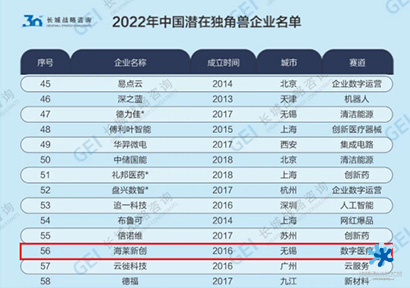 6月20日,2023中國(蘇州)獨角獸企業大會,長城戰略咨詢發布《中國潛在獨角獸企業研究報告2023》;2022年中國共有653家潛在獨角獸企業。惠山生命園的江蘇海萊新創醫療科技有限公司在數字醫療領域蟬聯上榜,排名由2021年的第442位躍升至第56位。本次無錫共12家企業上榜,海萊新創為惠山區唯一上榜企業。